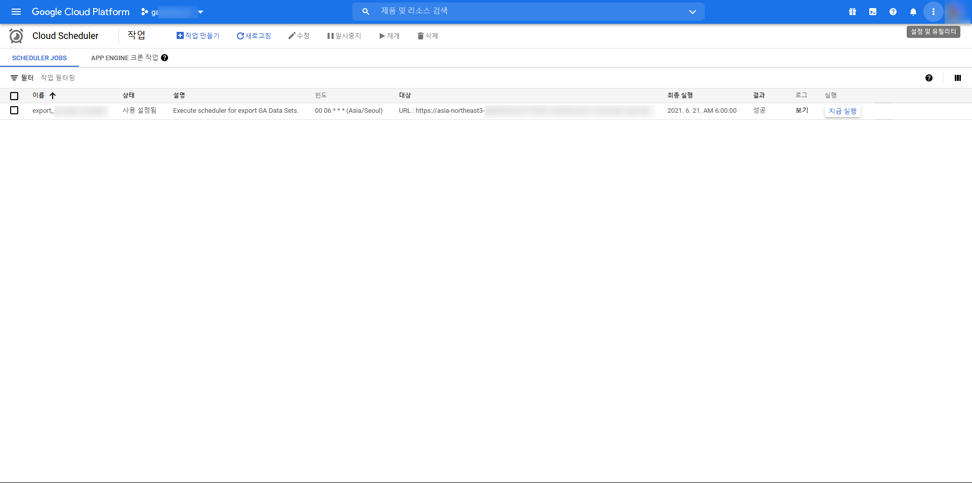 - 어쨌든 코드가 만들어지면 Scheduler에 해당 코드를 등록해야 합니다. 이제 Cloud Scheduler를 띄운 뒤 '+ 작업만들기' 를 클릭합니다.