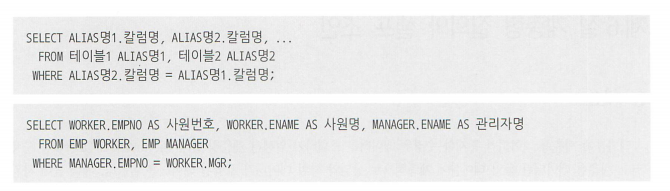 - 셀프 조인이랑 동일 테이블 사이의 조인을 의미함. 따라서 FROM 절에 동일 테이블이 2번 이상 타나탐. 동일 테이블 사이의 조인을 사용하면 테이블과 칼럼이 동일하기 때문에 Alias를 사용해야 함