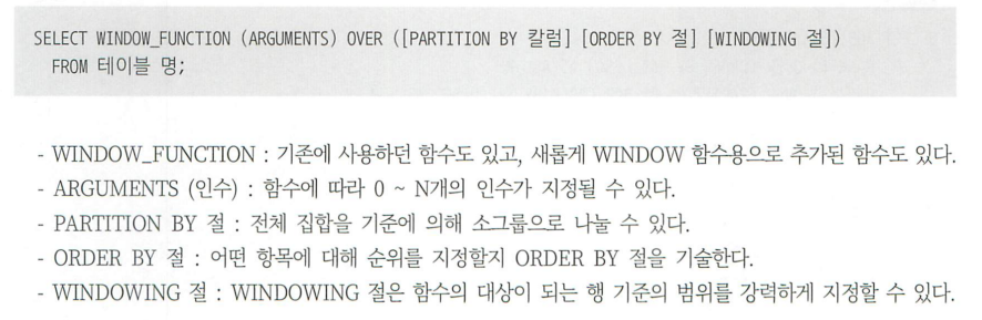 - 윈도우 함수에는 OVER 문구가 키워드로 필수 포함