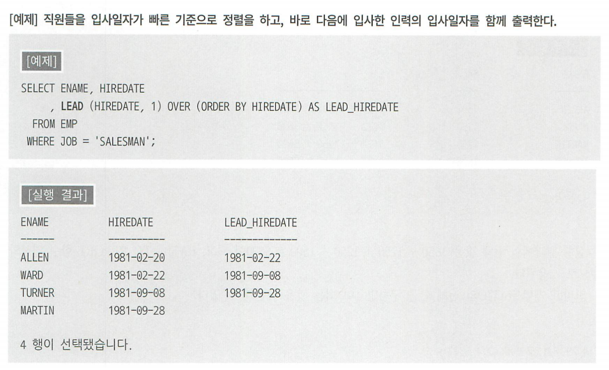 - LEAD 함수 → LEAD 함수를 이용해 파티션 별 윈도우에서 이후 몇번째 행의 값을 가져올 수 있다. SQL SERVER 미지원