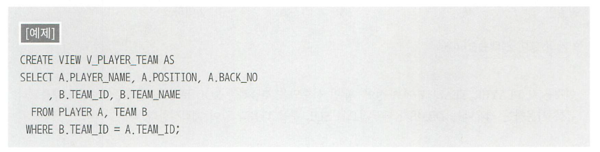 - 뷰의 생성은 아래와 같이 CREATE VIEW로 생성 가능