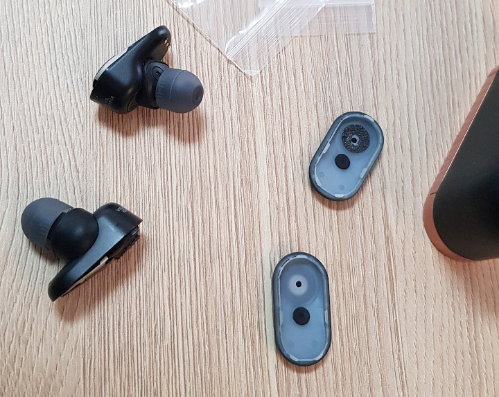 - 뚜껑을 따면 아래와 같은 모습입니다. 뚜껑 쪽의 검정색 동그라미 스펀지 같은게 크게 손상되지 않아야 합니다. 어느 한쪽엔 온전히 붙어야 하는데 크게 손상되면 향후 이어폰 터치가 제대로 되지 않습니다.