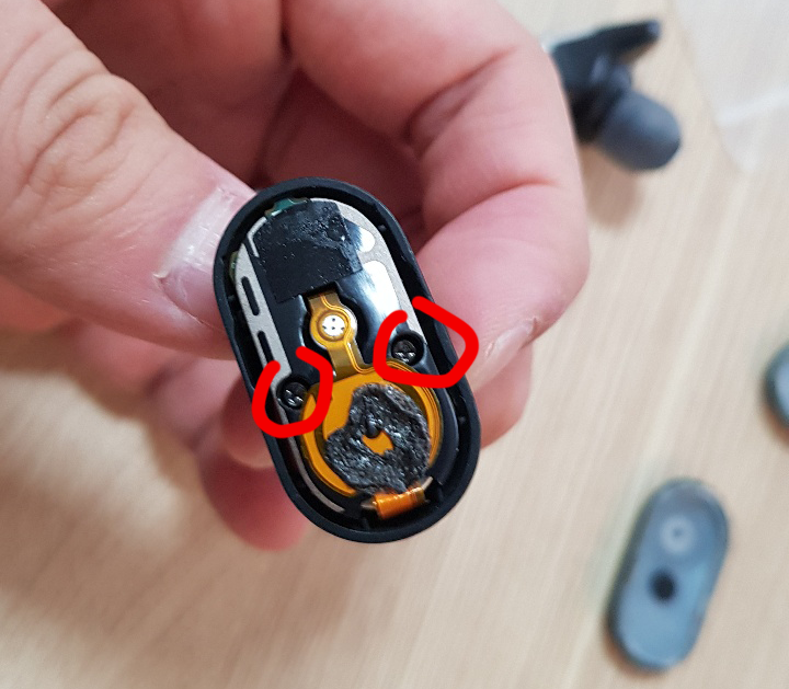 - 그리고 이어폰 내부에 보면 아래와 같이 2개의 나사가 고정되어 있습니다. 그것을 드라이버로 살살 풀어줍니다.