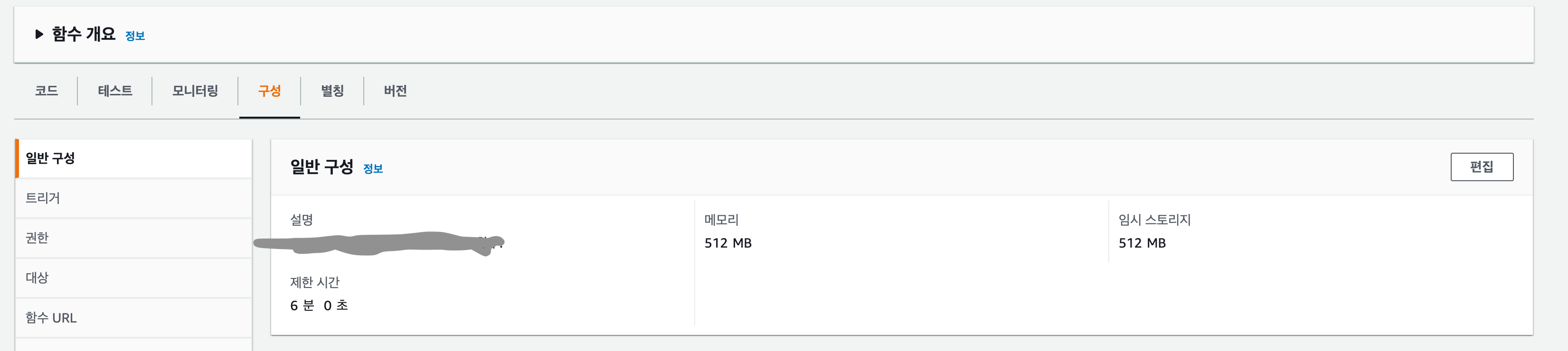 이럴 경우, 아래처럼 Lambda 구성 - 메모리 용량을 늘려주면 대부분 해결된다.